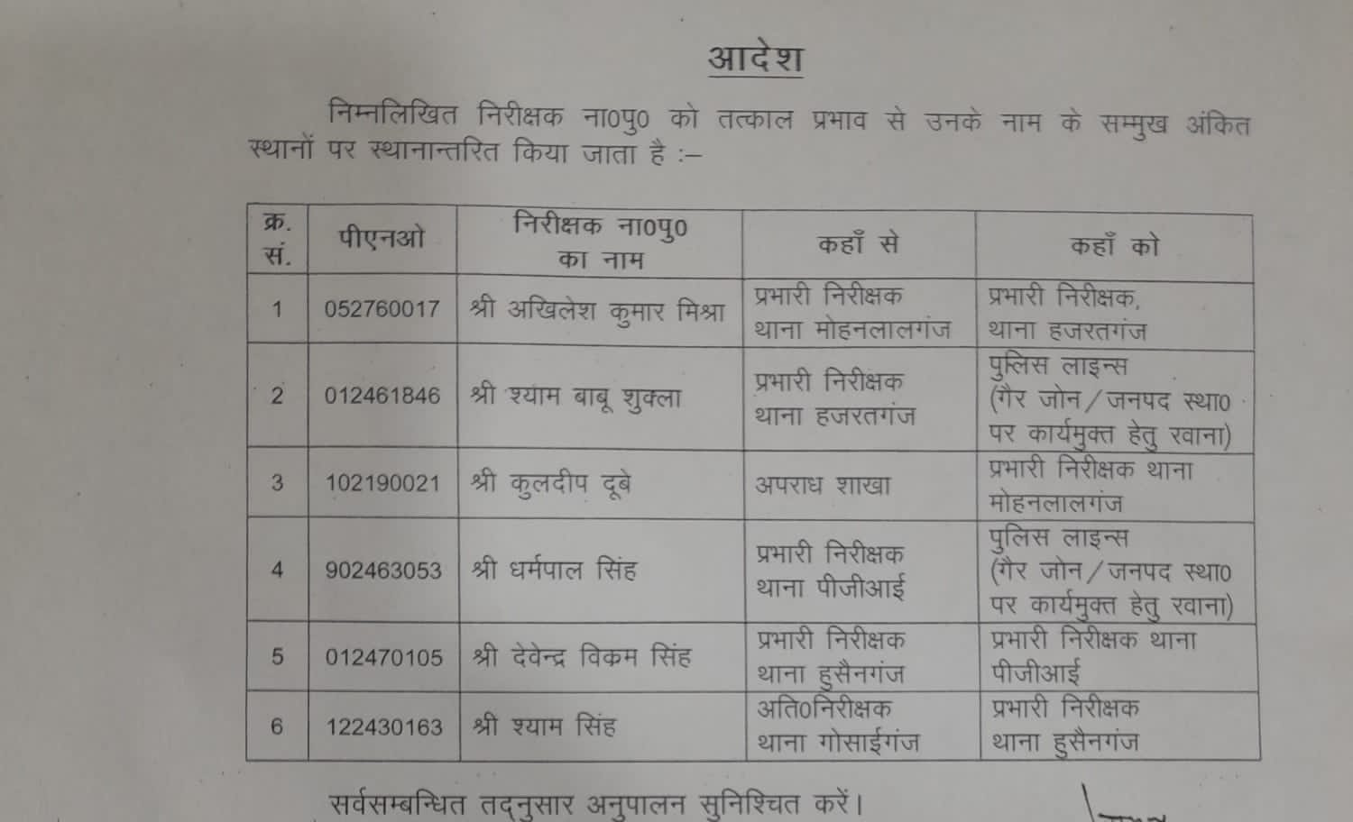छह निरीक्षकों के कार्यक्षेत्र बदले