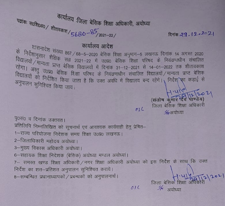 लखनऊ। धीरे-धीरे ठंडे ने अपना विकराल रूप दिखाना शुरू कर दिया है। उसके साथ ही साथ कोरोना वायरस व ओमीक्रोन ने भी यूपी में दस्तक दे दी है। ऐसे में अभिभावकों का अपने बच्चों के प्रति चिंता करना लाजमी है। फिलहाल अभिभावकों के लिए यह राहत भरी खबर है कि कोरोनावायरस ठंड को देखते हुए विद्यालयों की 31 दिसंबर से लेकर 14 जनवरी तक शीतकालीन अवकाश घोषित की गई है। प्राथमिक, उच्च प्राथमिक व जूनियर हाई स्कूल के बच्चों के 15 दिनों के लिए अवकाश रहेगा रहेगी। इस बात की जानकारी जिला बेसिक शिक्षा अधिकारी अयोध्या संतोष कुमार देव पांडे द्वारा की गई हैं।