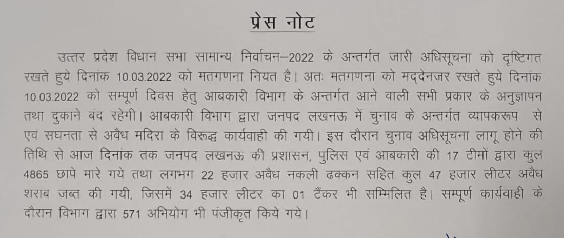 आबकारी विभाग द्वारा जनपद लखनऊ में चुनाव के अन्तर्गत व्यापकरूप से एवं सघनता से अवैध मदिरा के विरूद्ध कार्यवाही की गयी । इस दौरान चुनाव अधिसूचना लागू होने की तिथि से जनपद लखनऊ की प्रशासन, पुलिस एवं आबकारी की 17 टीमों द्वारा कुल 4865 छापे मारे गये तथा लगभग 22 हजार अवैध नकली ढक्कन सहित कुल 47 हजार लीटर अवैध शराब जब्त की गयी , जिसमें 34 हजार लीटर का 01 टैंकर भी सम्मिलित है । सम्पूर्ण कार्यवाही के दौरान विभाग द्वारा 571 अभियोग भी पंजीकृत किया गया है।