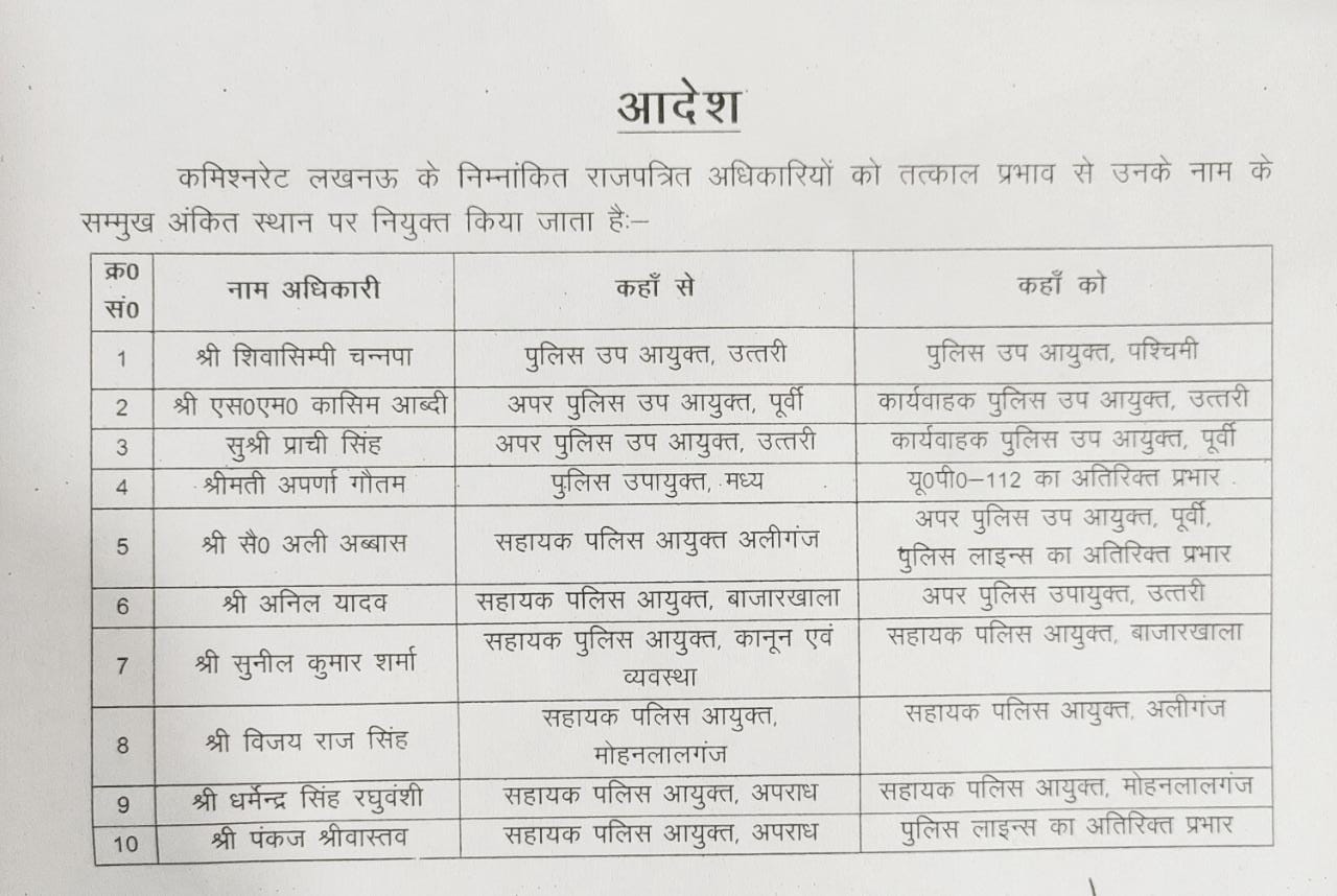 लखनऊ। सोमवार को पुलिस कमिश्नर डीके ठाकुर ने डीसीपी, एडीसीपी व एसीपी का स्थानांतरण किया गया है। डीसीपी एस.एम. कासिम आब्दी अपर पुलिस उपायुक्त पूर्वी से कार्यवाहक पुलिस उपायुक्त, उत्तरी बनाया गया है। इसी क्रम में 9 अधिकारियों का तबादला किया गया।