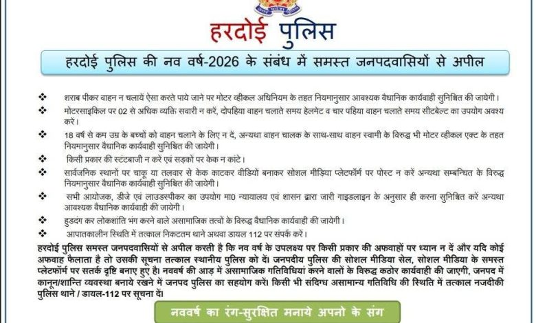 पुलिस का संदेश: “नववर्ष का रंग-सुरक्षित मनाएं अपनों के संग। हरदोई पुलिस आपकी सेवा में सदैव तत्पर है।”